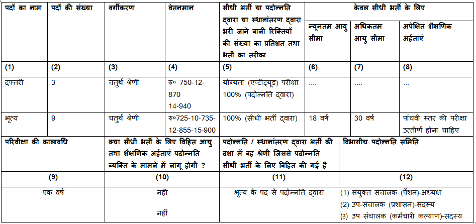 3. वर्गीकरण , वेतनमान आदि- सेवा का वर्गीकरण, पदों की संख्या, उनसे सम्बद्ध वेतनमान, उक्त पदों पर भरती का तरीका, आयु सीमा तथा अन्य बातें उक्त अनुसूची के कालम (3) से (12) तक में यथा विनिर्दिष्ट किये गये अनुसार होगी ।